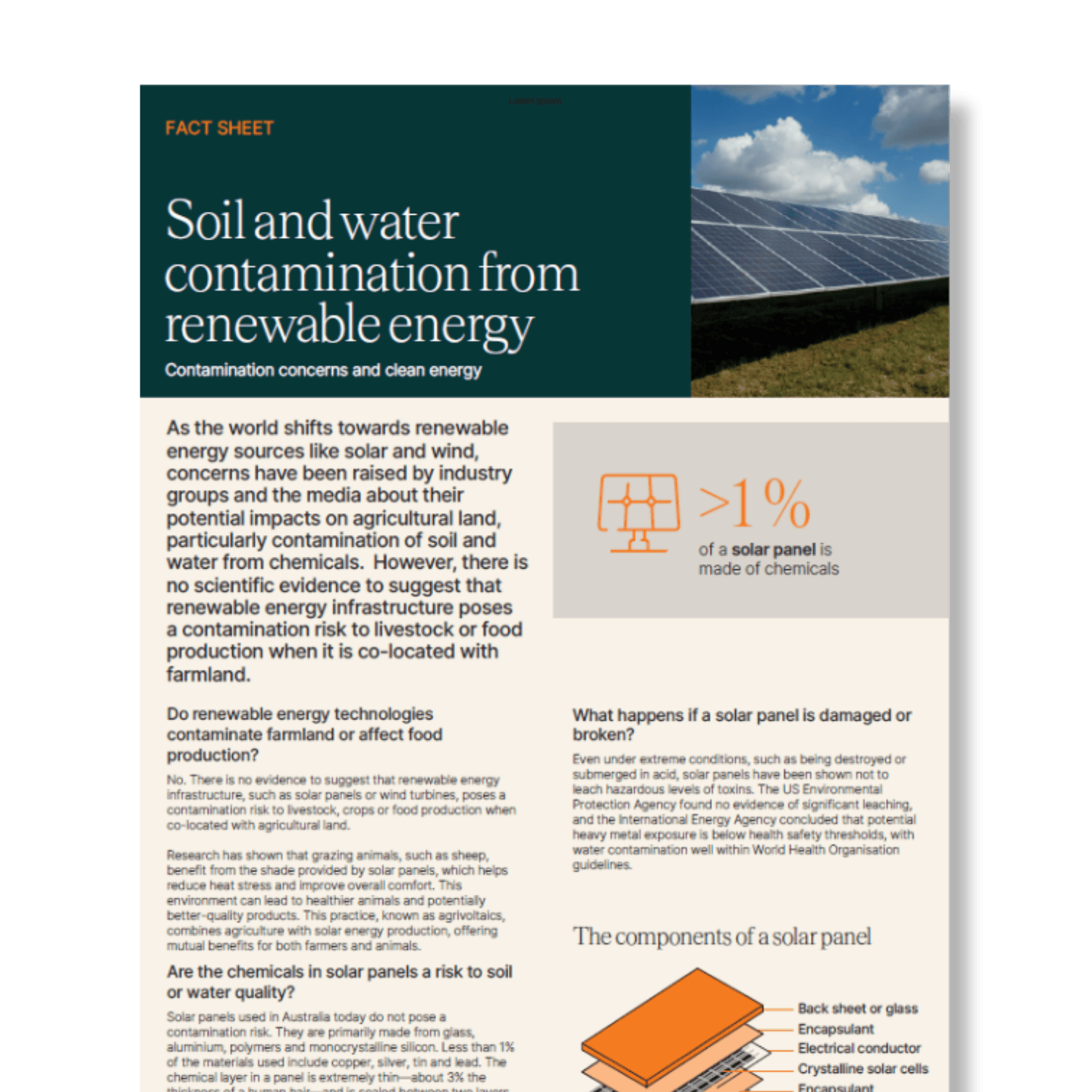 As the world shifts towards renewable energy sources like solar and wind, concerns have been raised by industry groups and the media about their potential impacts on agricultural land, particularly contamination of soil and water from chemicals. However, there is no scientific evidence to suggest that renewable energy infrastructure poses a contamination risk to livestock or food production when it is co-located with farmland.