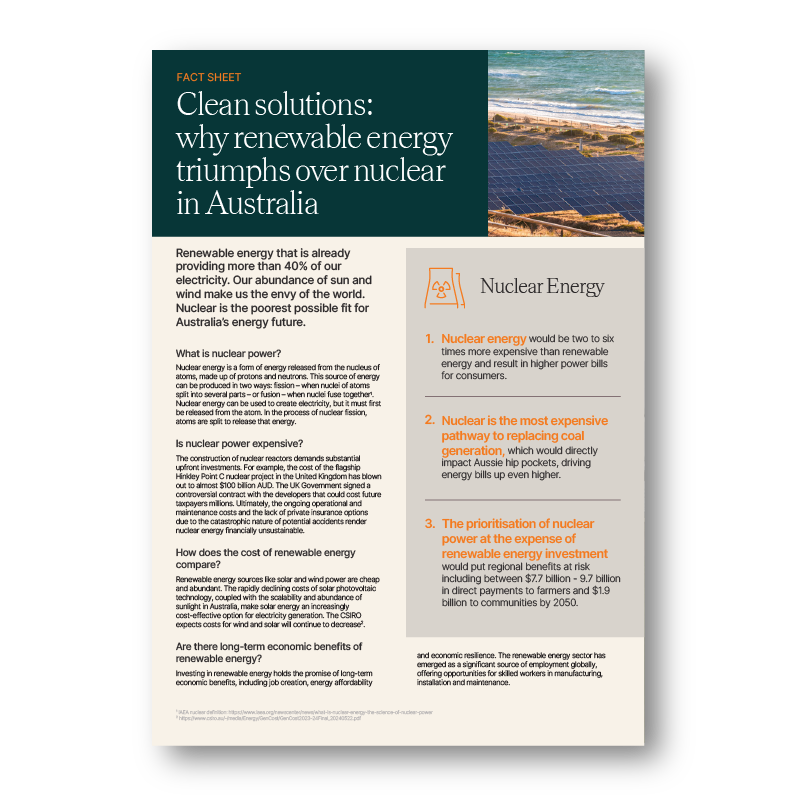 Renewable energy that is already providing more than 40% of our electricity. Our abundance of sun and wind make us the envy of the world. Nuclear is the poorest possible fit for Australia’s energy future.