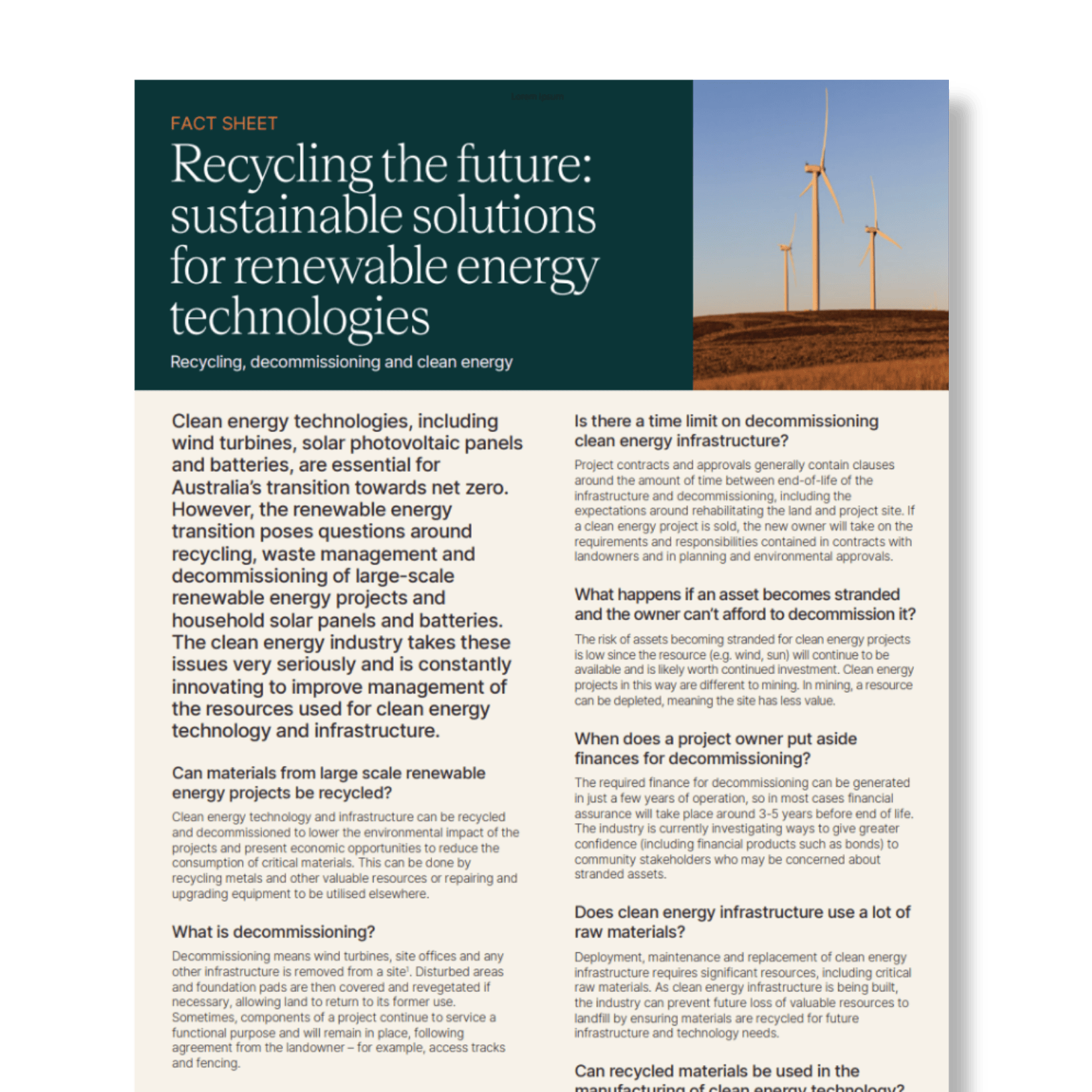 Clean energy technologies, including wind turbines, solar photovoltaic panels and batteries, are essential for Australia’s transition towards net zero. However, the renewable energy transition poses questions around recycling, waste management and decommissioning of large-scale renewable energy projects and household solar panels and batteries. The clean energy industry takes these issues very seriously and is constantly innovating to improve management of the resources used for clean energy technology and infrastructure.
