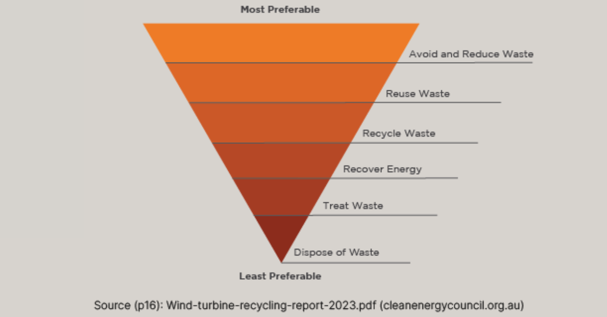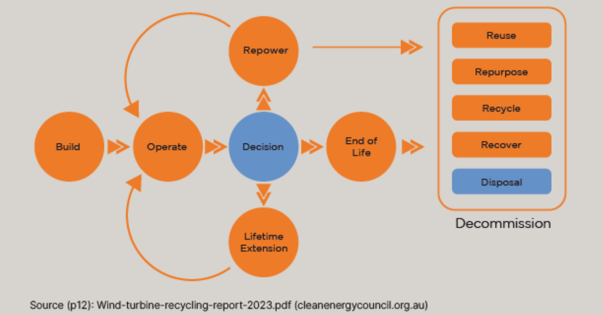 9 Winding up decommissioning, recycling and resource recovery of Australian wind turbines: https://assets.cleanenergycouncil.org.au/documents/Wind-turbine-recycling-report-2023.pdf