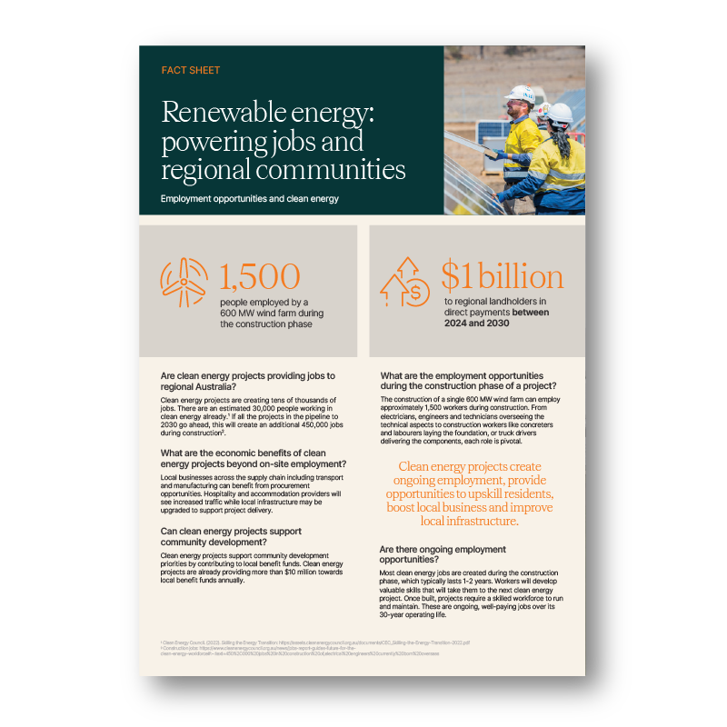 Clean energy projects create ongoing employment, provide opportunities to upskill residents, boost local business and improve local infrastructure.