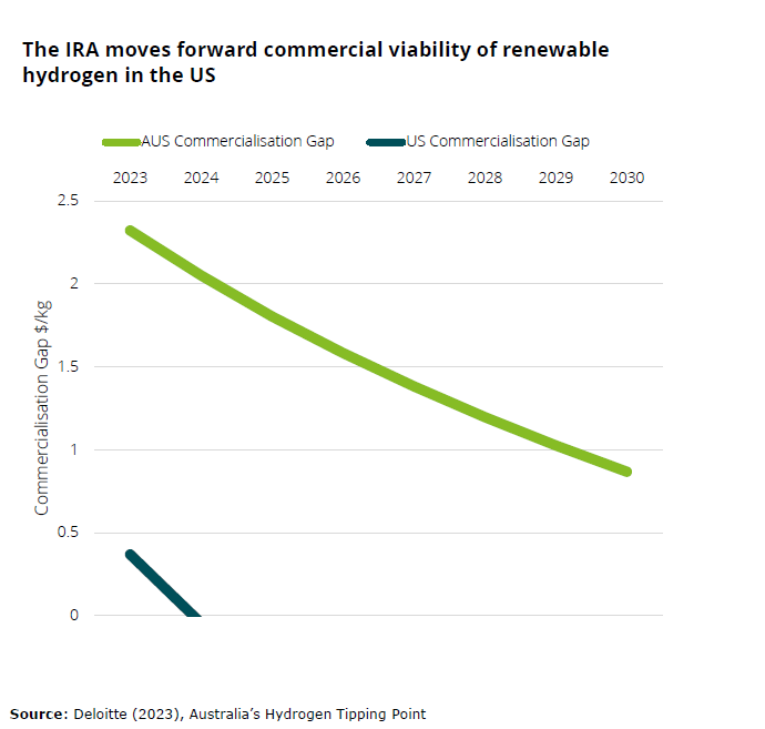The location of the annual convention is significant in itself. Rotterdam is home to Europe’s largest port which supplies ~13 per cent of the EU’s total consumed energy, and a large part of North-West Europe’s industries with fossil fuels and feedstock, much of it travelling on from the port along the Rhine River into Germany’s industrial heartland.A port tour reveals a breathtakingly vast industrial complex, spanning more than 40 kilometres inland from the North Sea and taking our group five hours to traverse by boat.Last decade, the port’s management began to explore diversification opportunities into ‘new energies’, recognising the dangers of high levels of exposure to fossil fuel-based commodities. Little did they know that ‘energy security’ would soon trump ‘climate’ on the risk matrix. Green hydrogen and its derivatives, such as renewable ammonia and methanol, became a strategic priority.The port is now planning multiple hydrogen (or H2 derivative) import terminals, as well as four new pipelines to run parallel to its existing oil pipeline to Germany: green hydrogen, ammonia, green LPG, and a ‘CO2 return’ pipeline back to Rotterdam, with the contents destined for sequestration in depleted offshore gas basins. (Let’s hope they have more success than Australia on this…)The port’s international hydrogen supply chain manager, Martijn Coopman, believes that Australia has a red hot chance at being a substantial supplier of green hydrogen derivatives to Europe, provided that it can scale up quickly. ‘Quickly’ is the operative word here, with international competition strong and growing.Martijn is a man in demand, with many prospective suppliers knocking on his door from Africa (locations such as Egypt, Mauritania, and Namibia), the Gulf States (Oman, Saudi Arabia), the Americas (Canada, Chile and Brazil), and elsewhere.Many of Australia’s states (most notably South Australia and Western Australia) have been working closely with the port to prepare the way for future trade. But concerns have been growing that Australian projects could struggle to get a foothold in this emerging market, given the dramatic reduction in production costs in other potential supply markets.According to Deloitte, the Act’s US $3/kg subsidy for green hydrogen means that the United States is expected to close the commercialisation gap for projects in the coming year (see chart below). By contrast, in Australia – absent new policy and incentives – commercially viable renewable hydrogen projects would not be possible until the mid-2030s.And it’s not just the US who are running ahead. Soon after the US introduced the IRA, Canada followed suit with its generous hydrogen incentives, and the port now considers it a frontrunner to supply the European market.