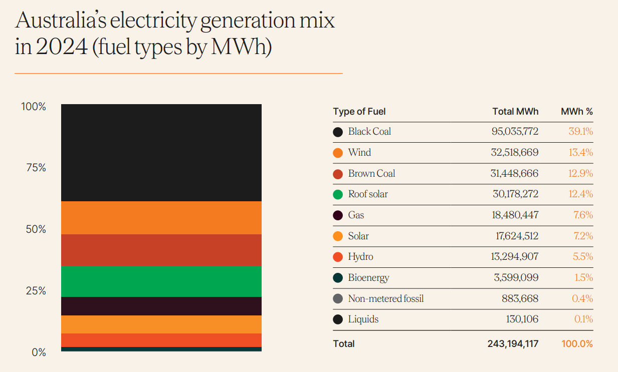 - 40 per cent of Australia’s electricity was provided by renewables in 2024, with fossil fuels still making up the majority of Australia’s energy mix (60%).