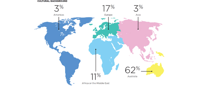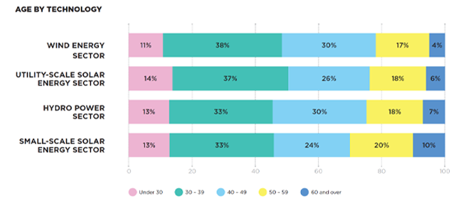 68 per cent of the Australian clean energy workforce was born in Australia, which is similar to the entire Australian population. The 30–40 age group is the most diverse, while the over 60 category is the least diverse.