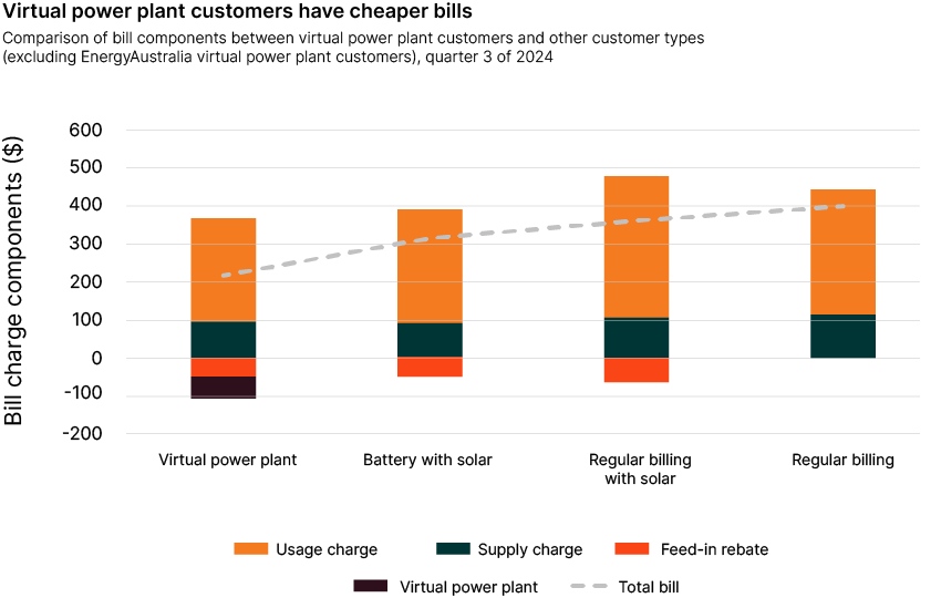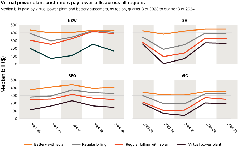 The ACCC’s Inquiry into the National Electricity Market report (July 2025) found that households with rooftop solar and a battery pay on average $323 per quarter for their energy bills but can save an additional $106 if they are signed up to a VPP, bringing them down to $217 per quarter on average (Figure 1 & 2).